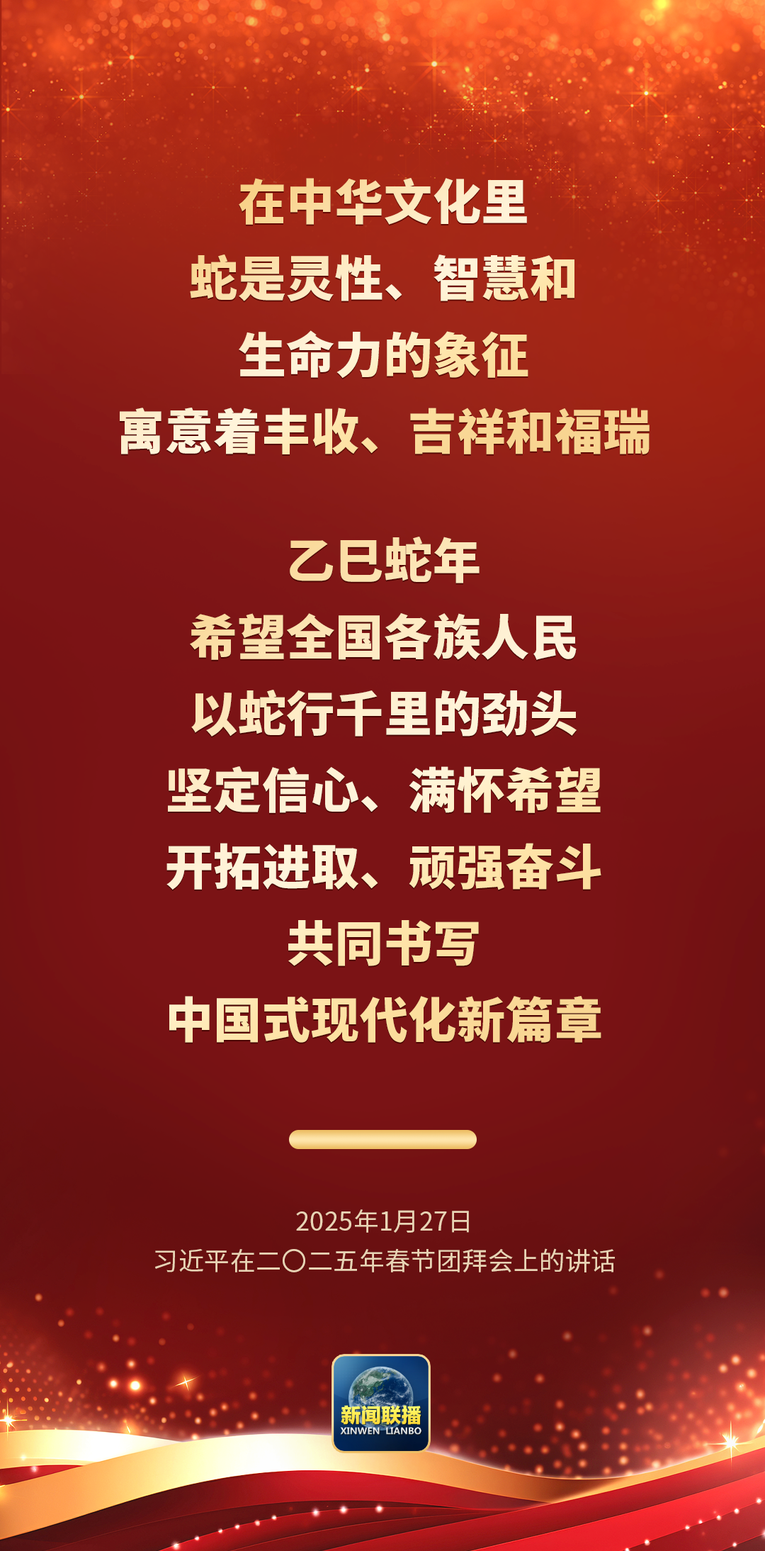 在中华文化里,蛇是灵性、智慧和生命力的象征,寓意着丰收、吉祥和福瑞。乙巳蛇年,希望全国各族人民以蛇行千里的劲头,坚定信心、满怀希望,开拓进取、顽强奋斗,共同书写中国式现代化新篇章。