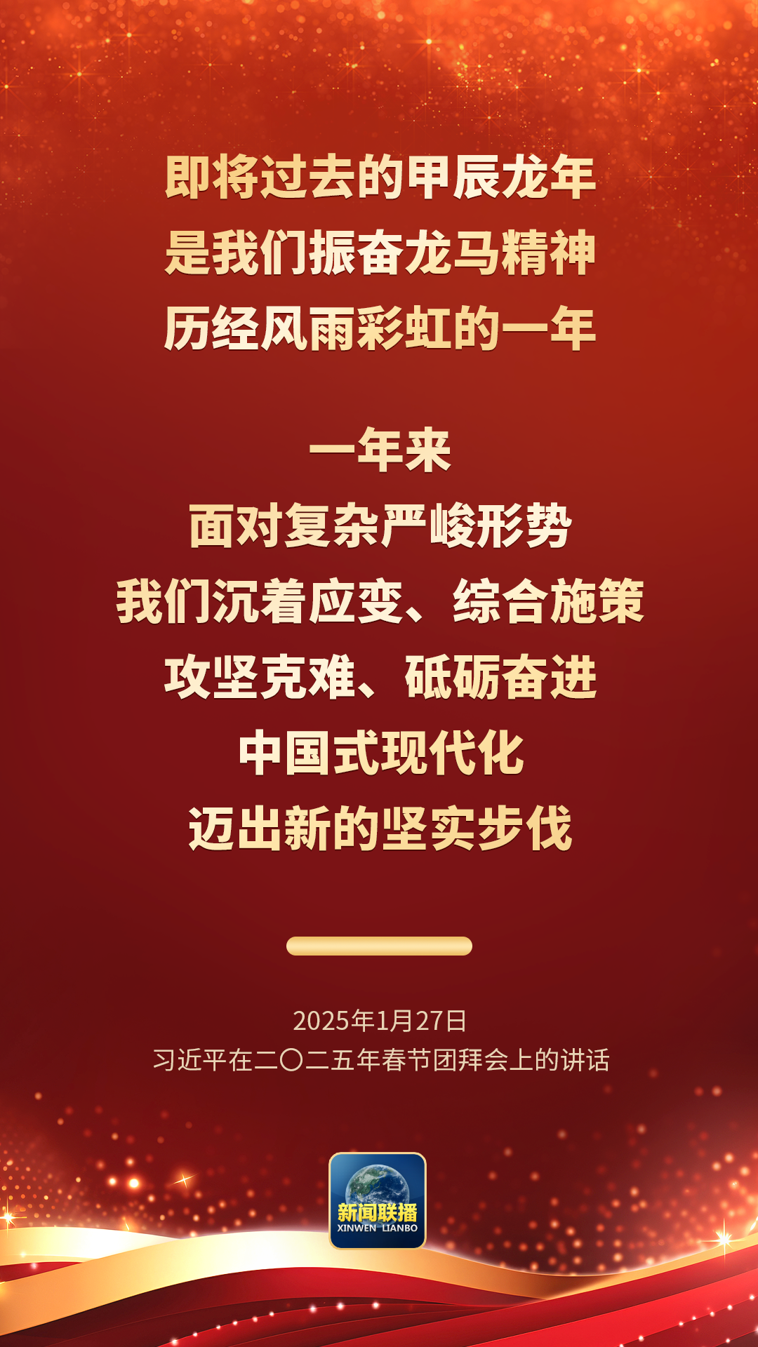 即将过去的甲辰龙年,是我们振奋龙马精神、历经风雨彩虹的一年。一年来,面对复杂严峻形势,我们沉着应变、综合施策,攻坚克难、砥砺奋进,中国式现代化迈出新的坚实步伐。