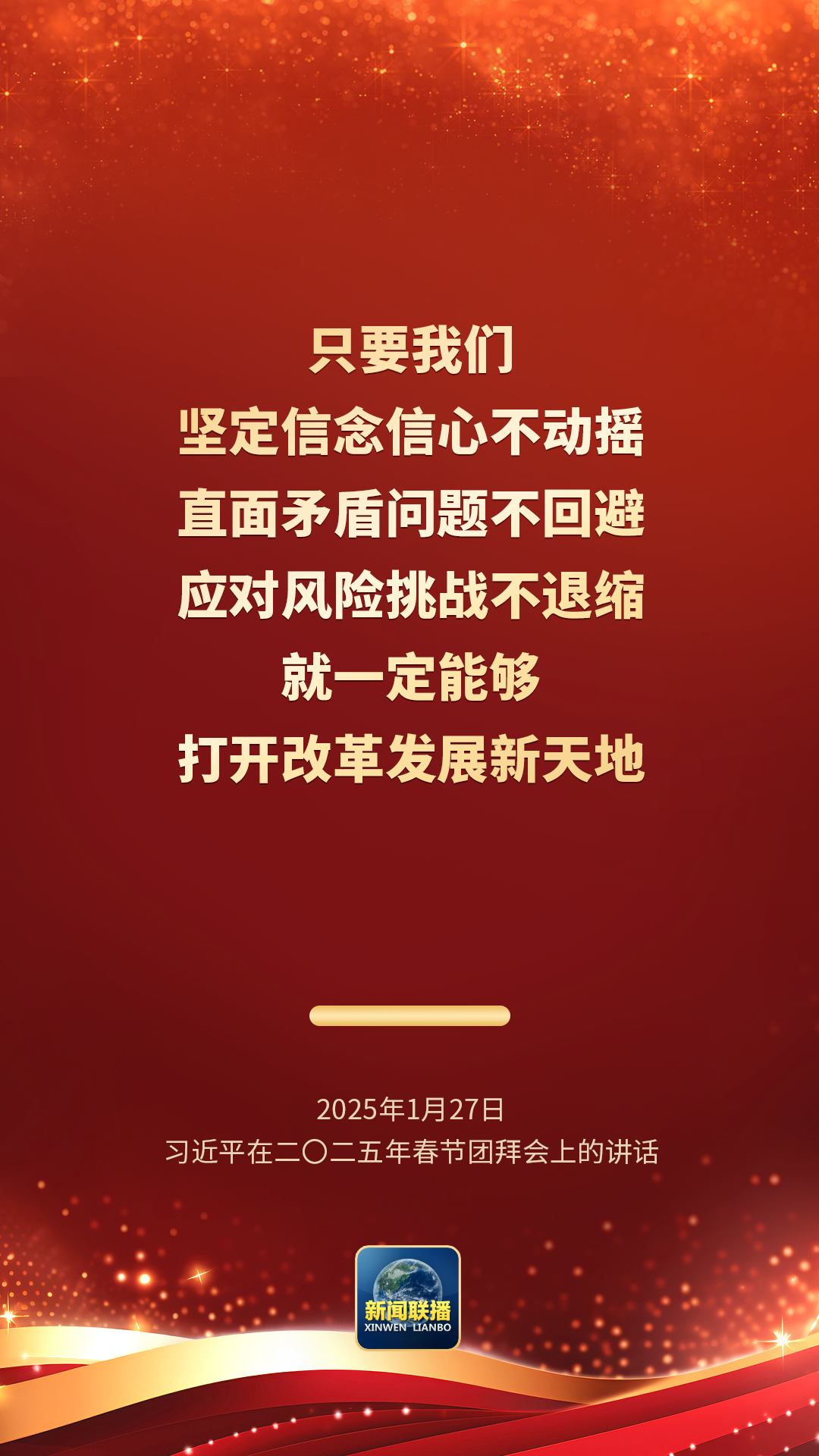 一年来的发展历程很不平凡,成绩令人鼓舞。我们用拼搏奋斗再次证明,任何艰难险阻都挡不住中国人民追求美好生活的前进步伐,都挡不住我们推进强国建设、民族复兴的历史进程。只要我们坚定信念信心不动摇,直面矛盾问题不回避,应对风险挑战不退缩,就一定能够打开改革发展新天地!